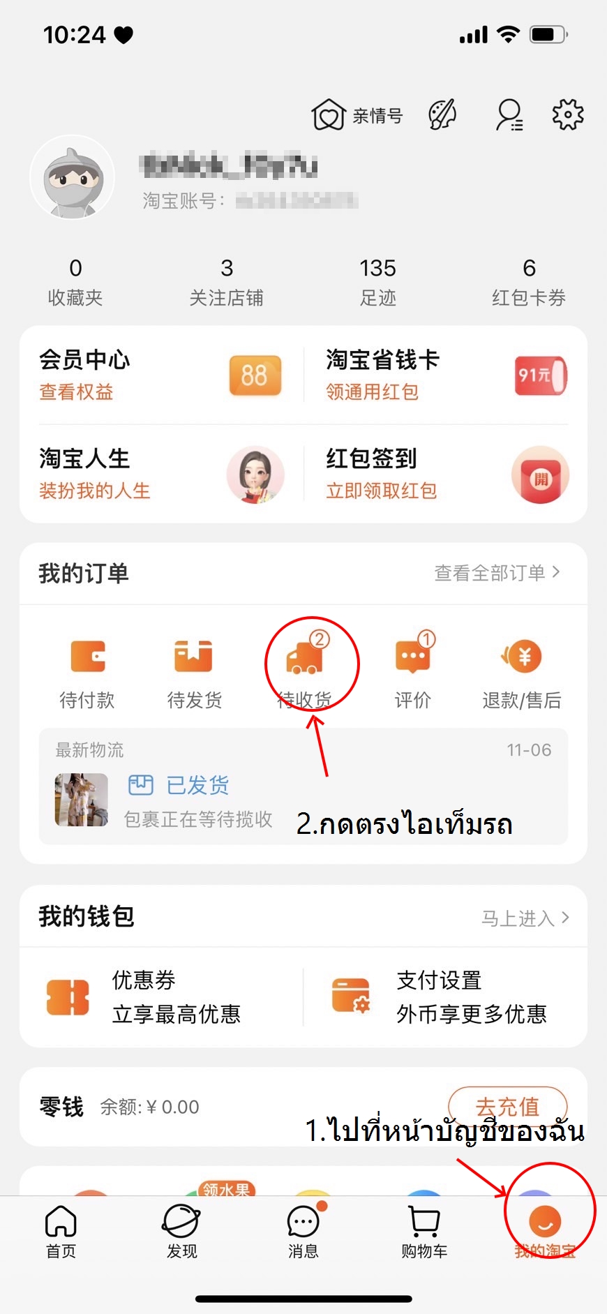 1.ไปที่หน้าบัญชี TAOBAO ของฉัน และกดที่รูปรถขนส่ง