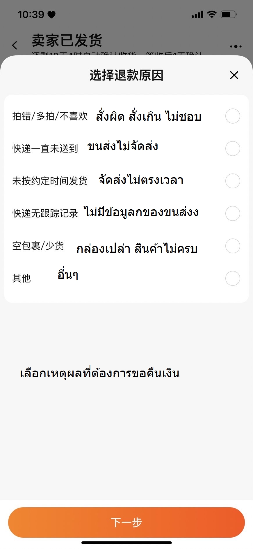 6. เลือกเหตุผลการขอคืนเงิน ตามด้านล่างนี้ แล้วกดสีส้ม